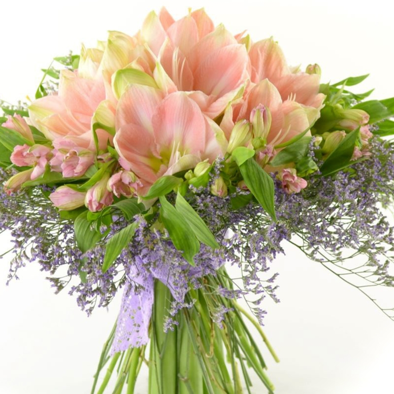 Букет состоит из 6 амариллисов, 12 веток альстромерий, 9 лимониум, прозрачная упаковка, атласная лента.