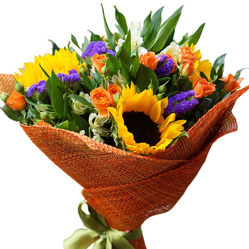 Букет состоит из 5 кустовых роз, 3 подсолнуха, 6 веток альстромерии, 5 веток статицы, зелень, красивая упаковка, атласная лента.