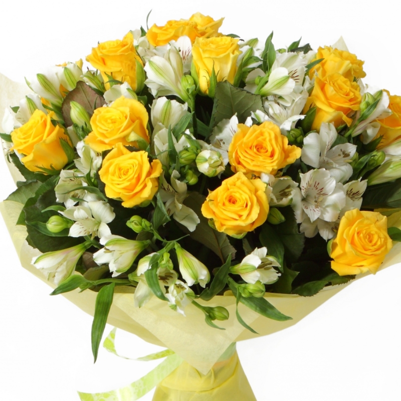 Букет состоит из 15 желтых роз, 9 веток альстромерий, зелень, красивая упаковка, атласная лента.