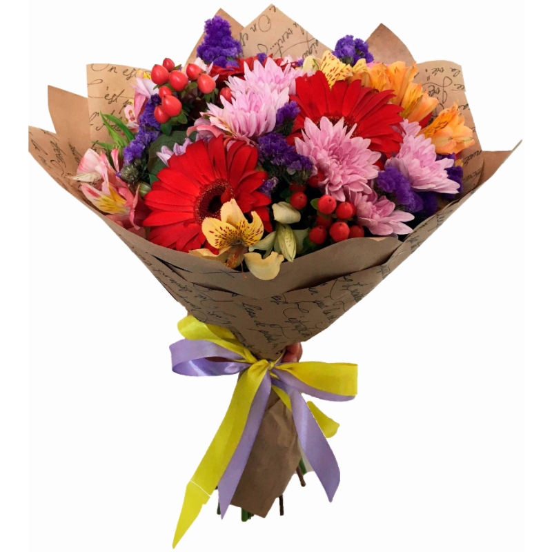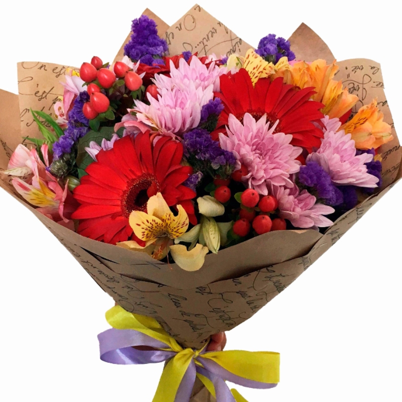 Букет состоит из 5 красных гербер, 4 ветки альстромерии, 3 ветки хризантемы, 3 гиперикума, 4 статица, крафт, атласная лента.