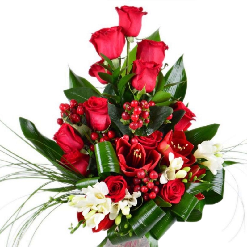 Букет состоит из 13 роз, 1 амариллис, 3 ветки альстромерии, 4 гиперикума, аспидистра, зелень, прозрачная упаковка, атласная лента.