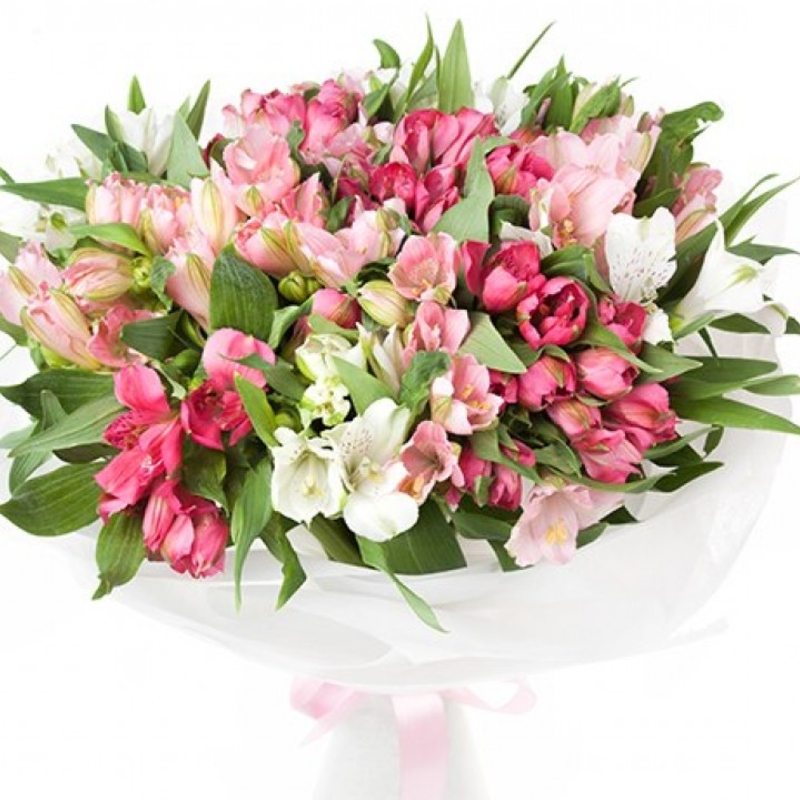 Букет состоит из MIX из 19 альстромерий, красивая упаковка, атласная лента.