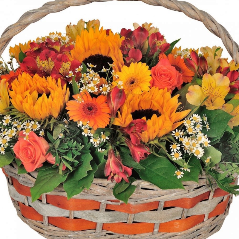 Букет состоит из 5 подсолнухов, 5 роз, 8 веток альстромерии, 7 гербер, 6 веток танацетума, зелень, корзина, оазис.