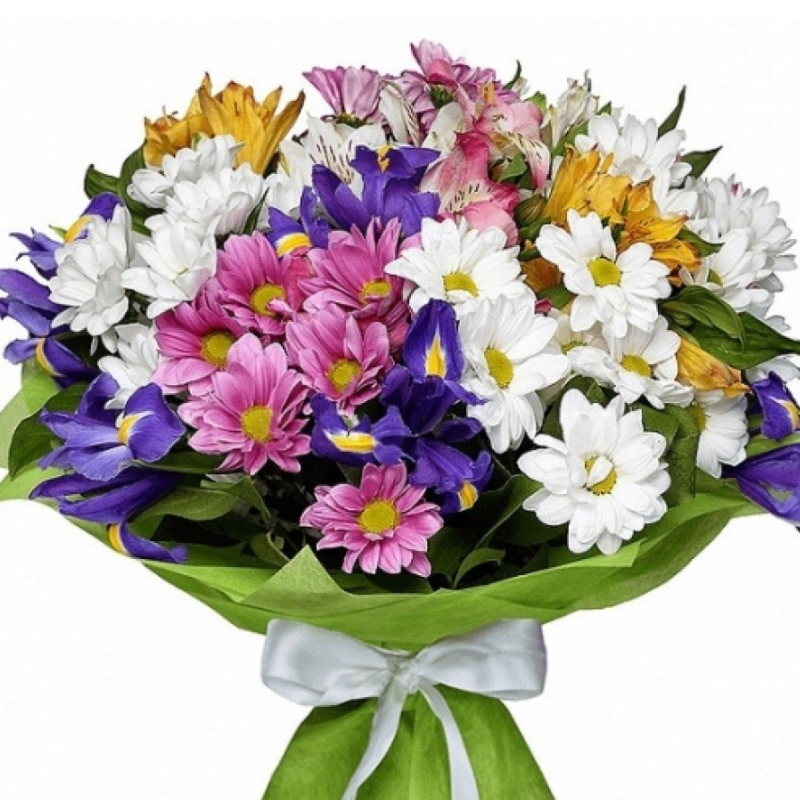 Букет состоит из 5 веток хризантем, 5 альстромерий, 9 ирисов, зелень, красивая упаковка, атласная лента.