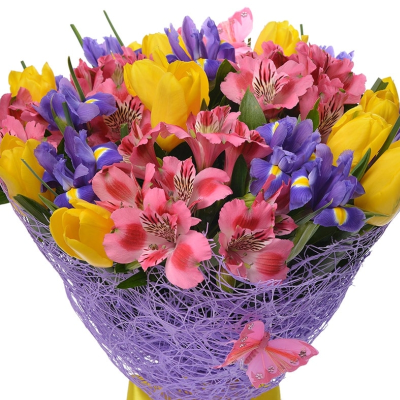 Букет состоит из 11 тюльпанов, 11 ирисов, 7 альстромерий, красивая упаковка, атласная лента.