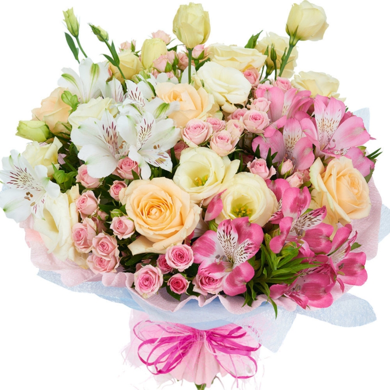 Букет состоит из 5 кремовых роз, 5 веток эустомы, 5 кустовых роз, 4 альстромерии, зелень, красивая упаковка, атласная лента.