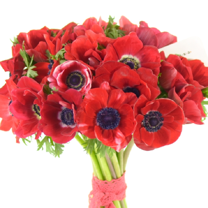 Букет состоит из 29 красных анемонов, прозрачная упаковка, атласная лента.