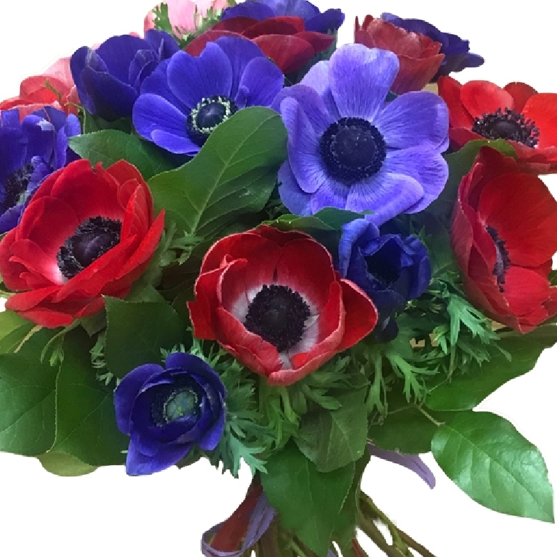 Букет состоит из 9 красных анемонов, 8 синих анемонов, прозрачная упаковка, атласная лента.