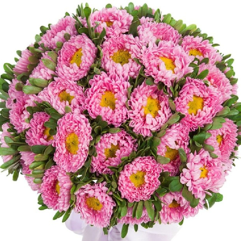 Букет состоит из 51 розовая астра, зелень, прозрачная упаковка, атласная лента.