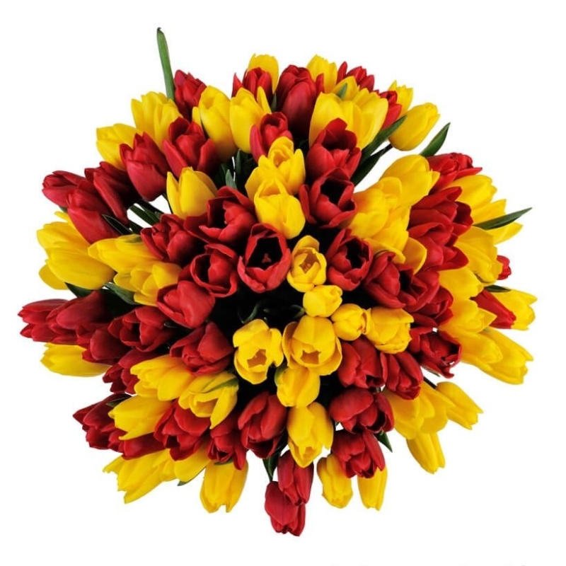Букет состоит из 51 красный тюльпан, 50 желтых тюльпанов, атласная лента.