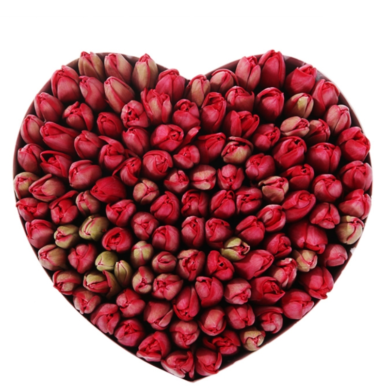Букет состоит из 101 красный тюльпан, коробка в виде сердца, оазис.