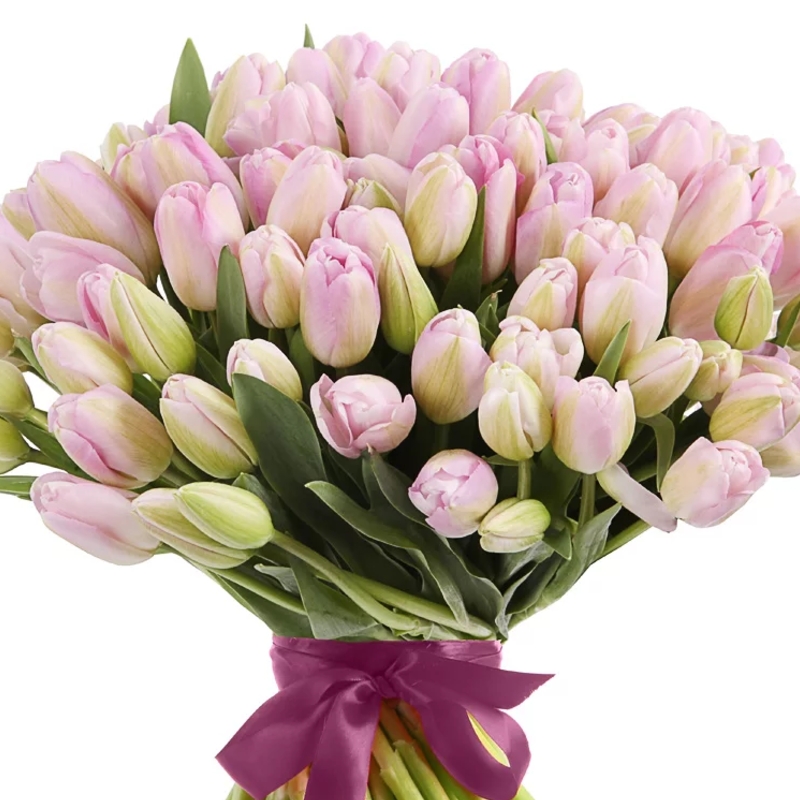 Букет состоит из 101 розовый тюльпан, прозрачная упаковка, атласная лента.