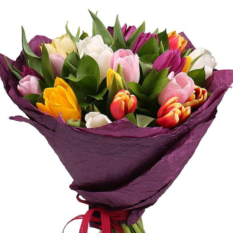 Букет состоит из MIX из 21 тюльпана, зелень, красивая упаковка, атласная лента.