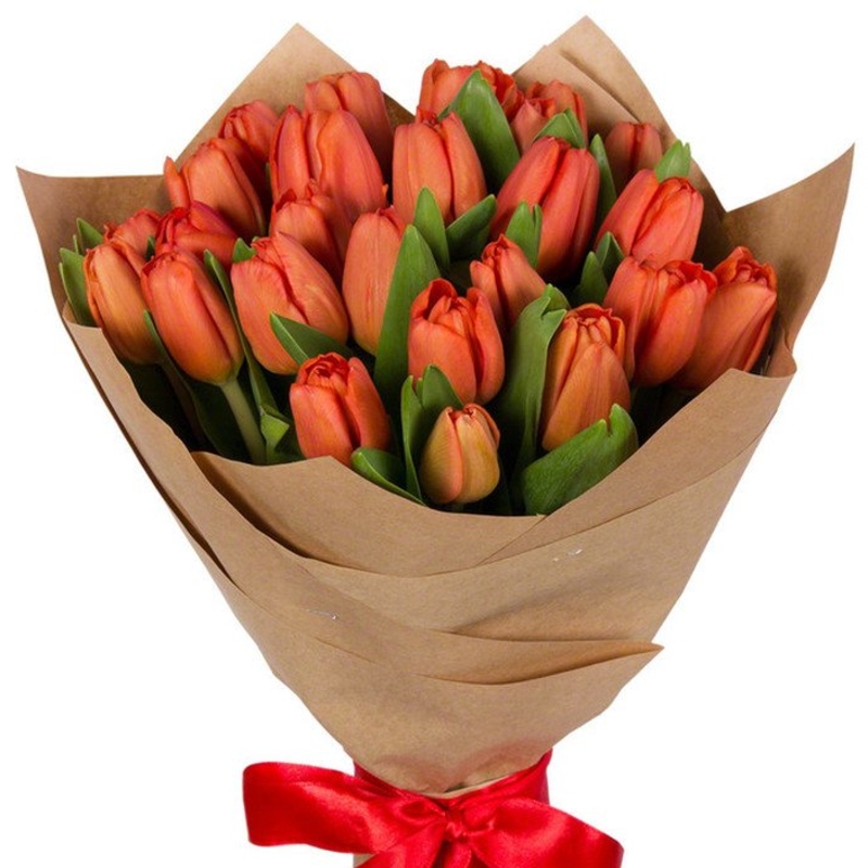 Букет состоит из 25 красных тюльпанов, крафт, атласная лента.