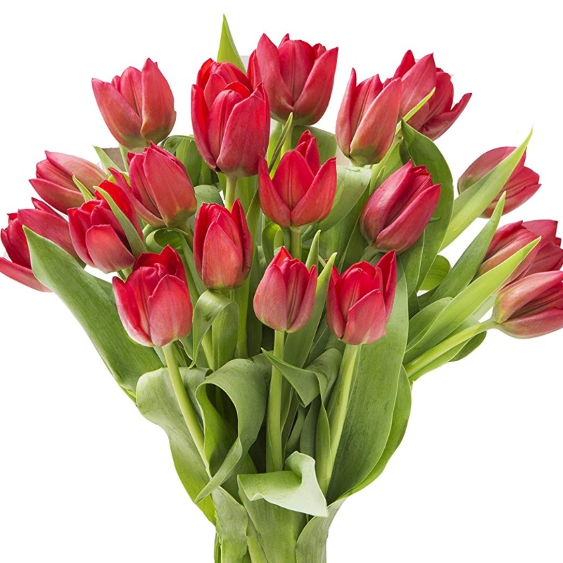 Букет состоит из 25 красных тюльпанов, прозрачная упаковка, атласная лента.