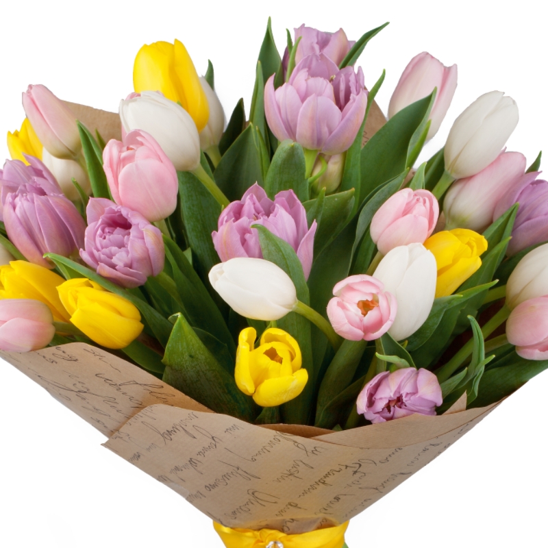 Букет состоит из 35 разноцветных тюльпанов, крафт, атласная лента.