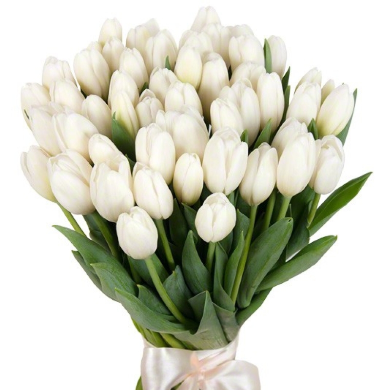 Букет состоит из 35 белых тюльпанов, прозрачная упаковка, атласная лента.
