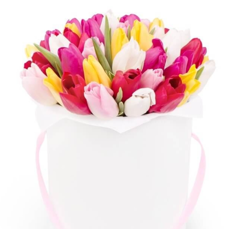 Букет состоит из MIX из 35 тюльпанов, коробка, оазис.