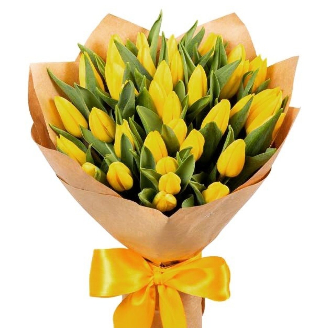 Букет состоит из 35 желтых тюльпанов, крафт, желтая лента.