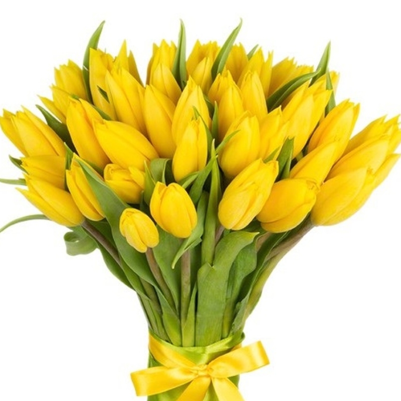 Букет состоит из 35 желтых тюльпанов, прозрачная упаковка, желтая лента.