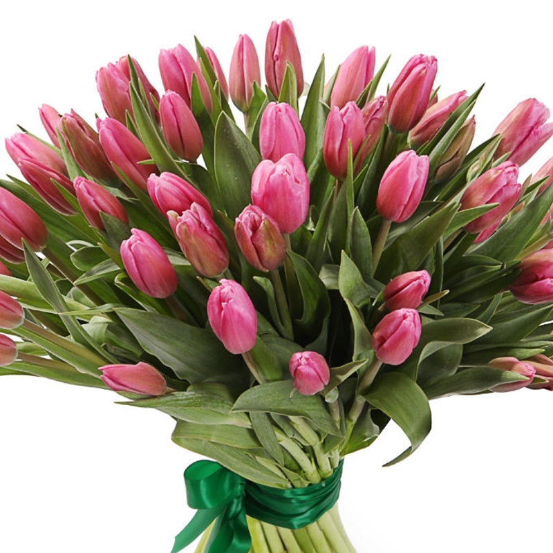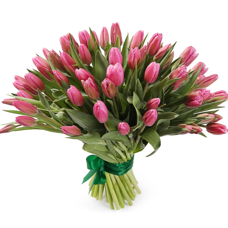 Букет состоит из 51 розовый тюльпан, прозрачная упаковка, атласная лента.