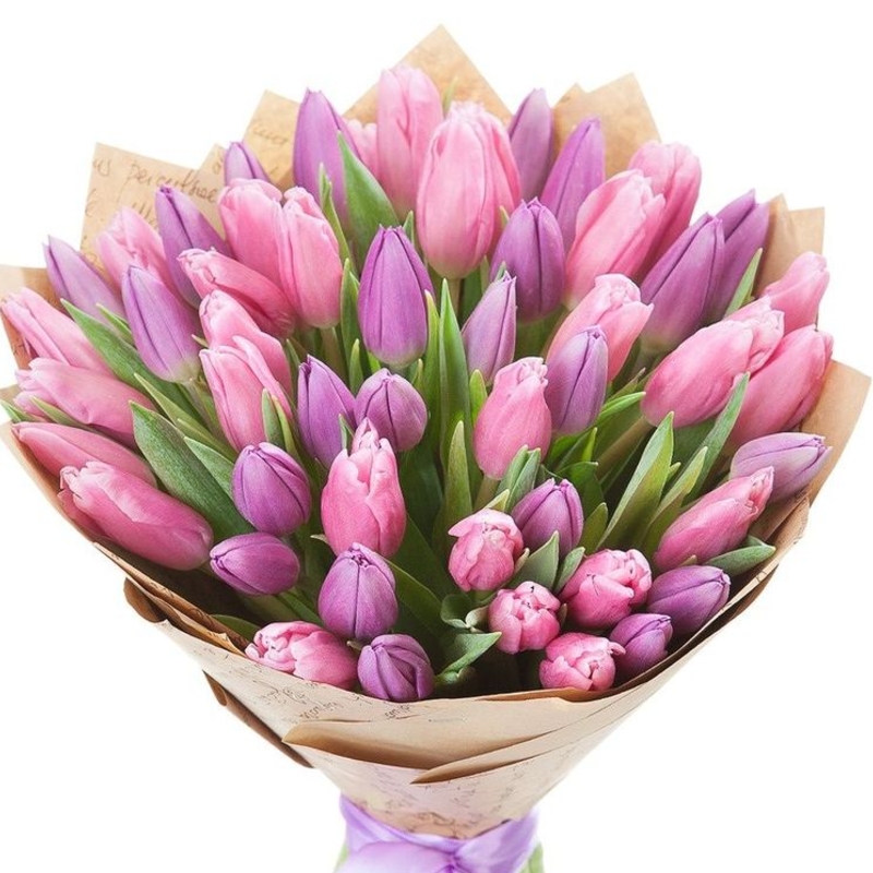 Букет состоит из 26 сиреневых тюльпанов, 25 розовых тюльпанов, красивая упаковка, атласная лента.