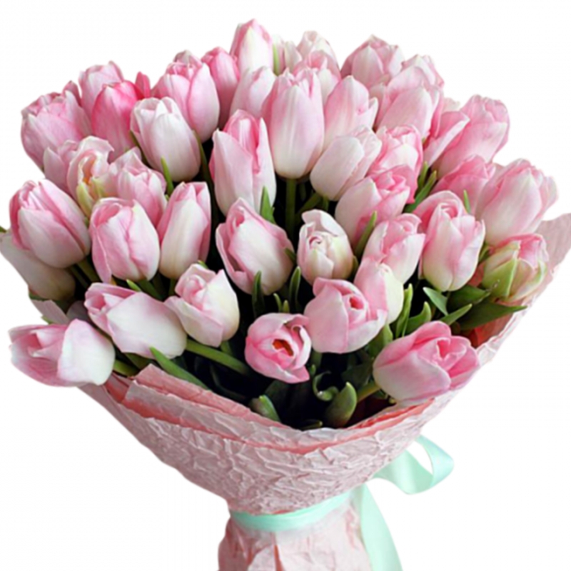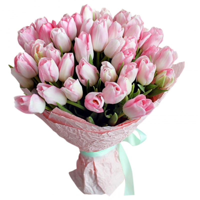 Букет состоит из 51 розовый тюльпан, крафт, атласная лента.