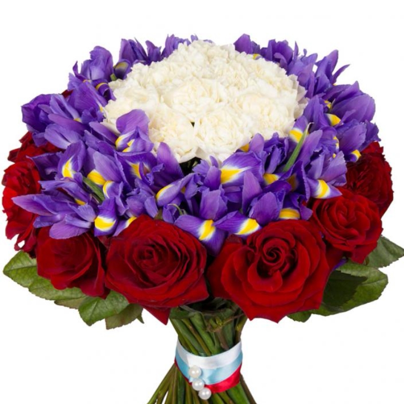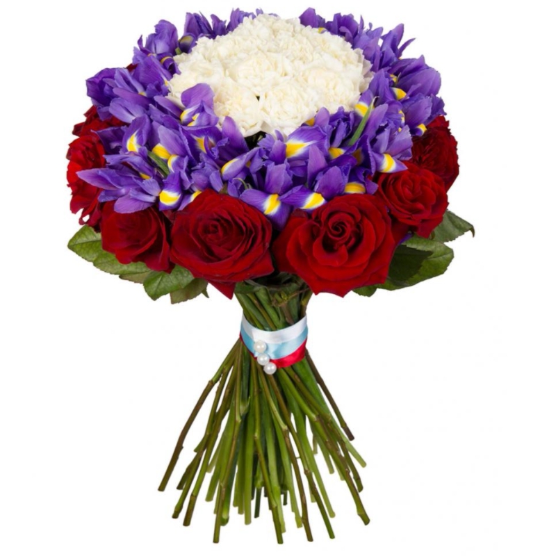 Букет состоит из 17 красных роз, 23 ириса, 13 белых гвоздик, прозрачная упаковка, атласная лента.