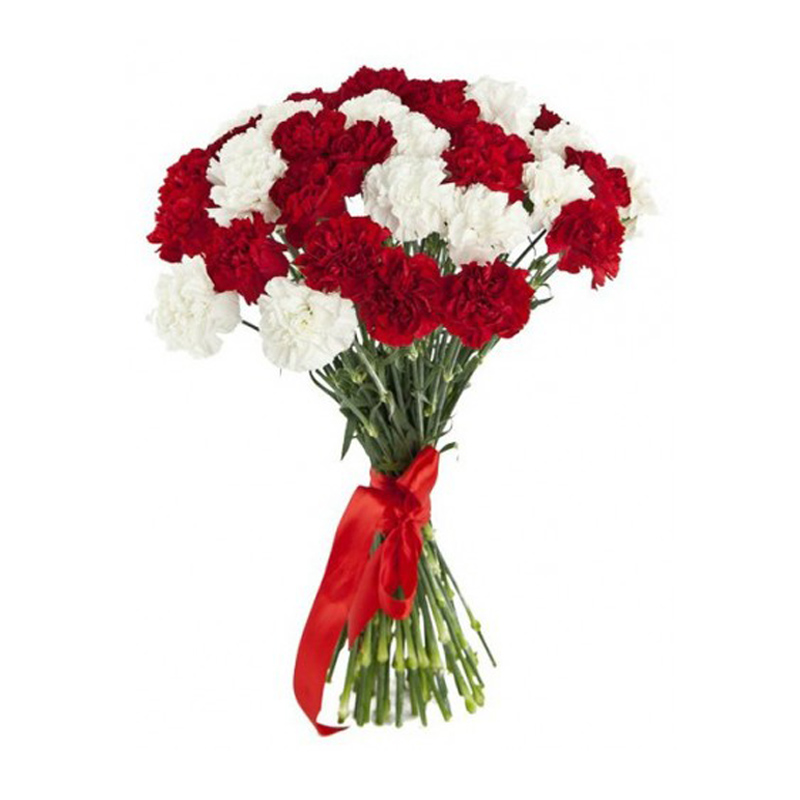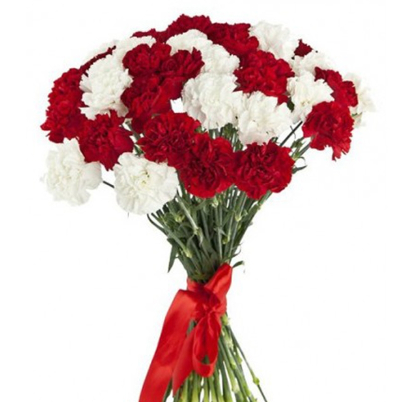 Букет состоит из 16 красных гвоздик, 15 белых гвоздик, прозрачная упаковка, атласная лента.