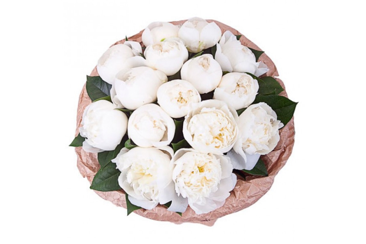 Букет состоит из 15 белых пионов, крафт, атласная лента.