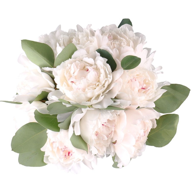 Букет состоит из 9 белых пионов, эвкалипт, прозрачная упаковка, атласная лента.