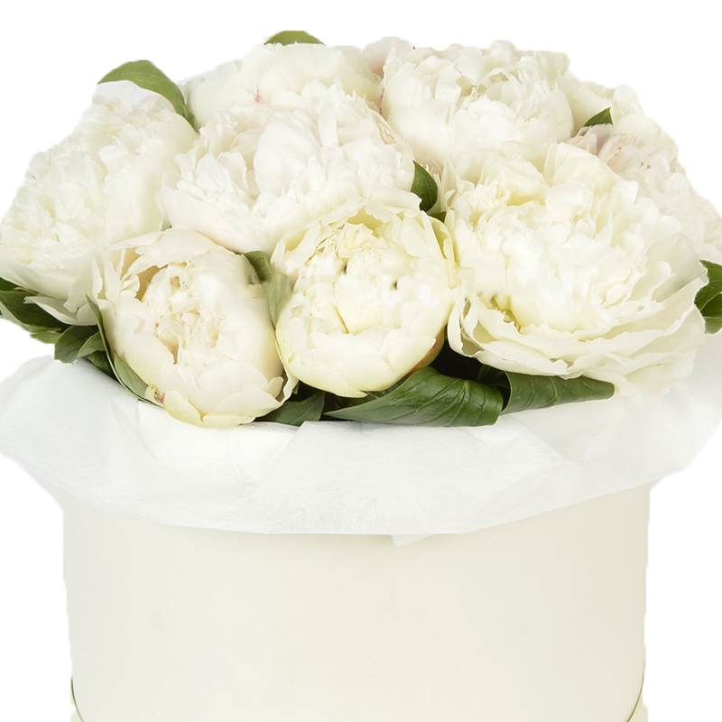 Букет состоит из 15 белых пионов, зелень, коробка, оазис.