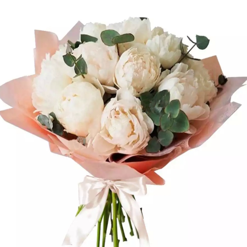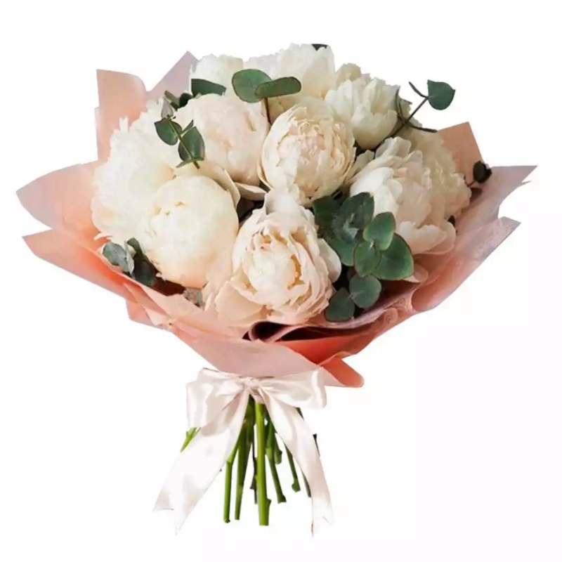 Букет состоит из 13 белых пионов, эвкалипт, красивая упаковка, атласная лента.