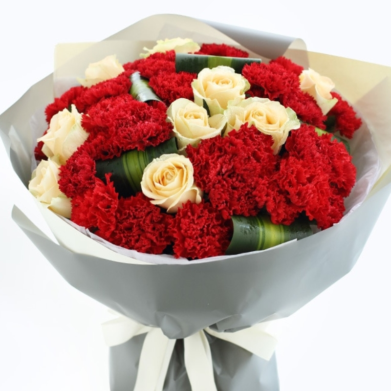 Букет состоит из 11 белых роз, 26 гвоздик, зелень, красивая упаковка, атласная лента.