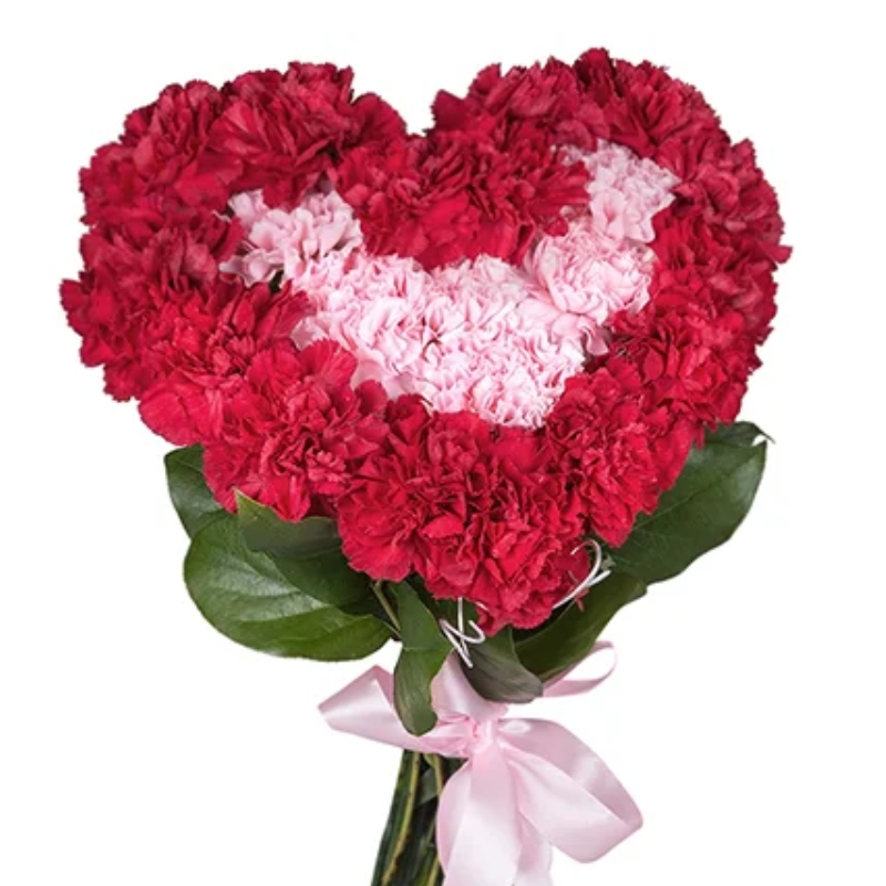 Букет состоит из 24 красных гвоздик, 7 розовых гвоздик, прозрачная упаковка, атласная лента.