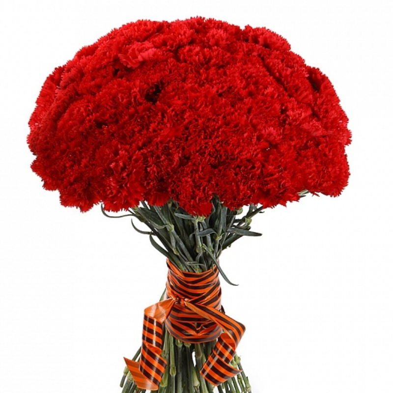 Букет состоит из 51 красная гвоздика, прозрачная упаковка, атласная лента.