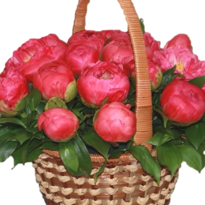 Букет состоит из 23 красных пионов, зелень, корзина, оазис.