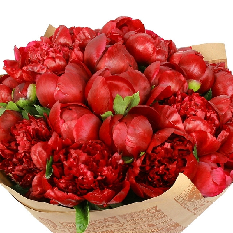 Букет состоит из 25 красных пионов, крафт, атласная лента.