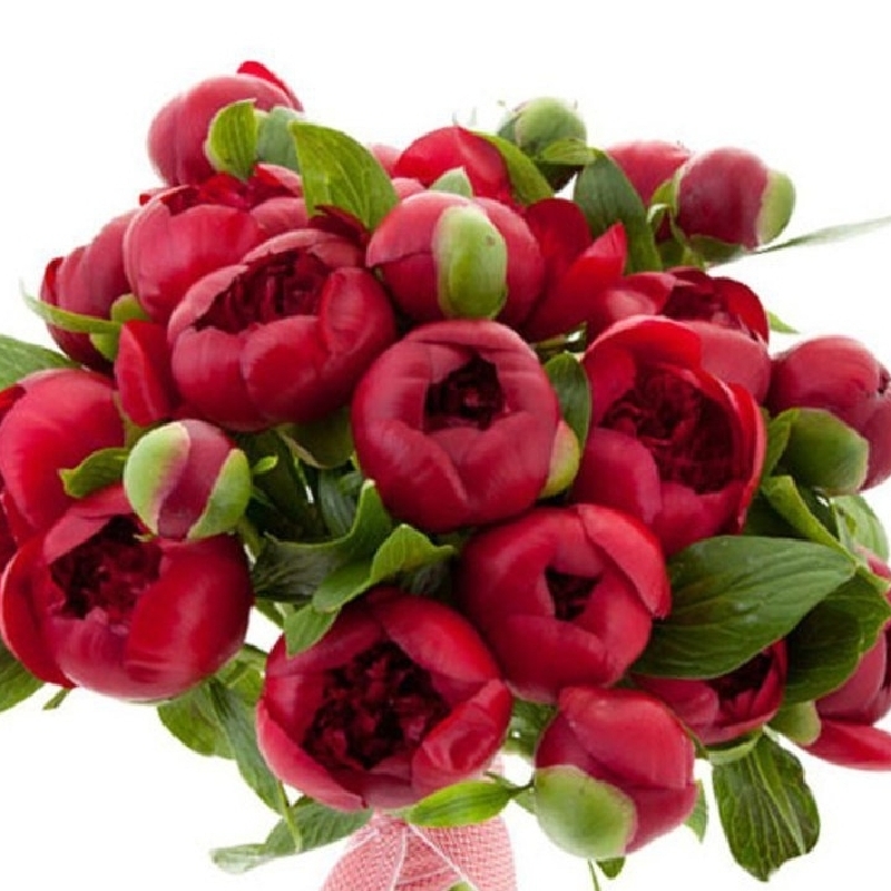 Букет состоит из 25 красных пионов, зелень, прозрачная упаковка, атласная лента.
