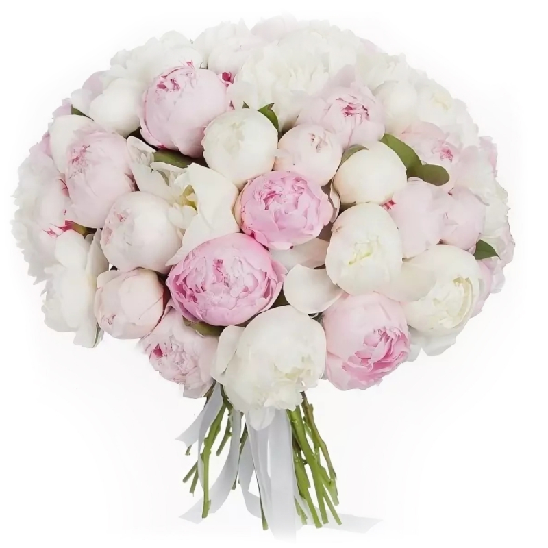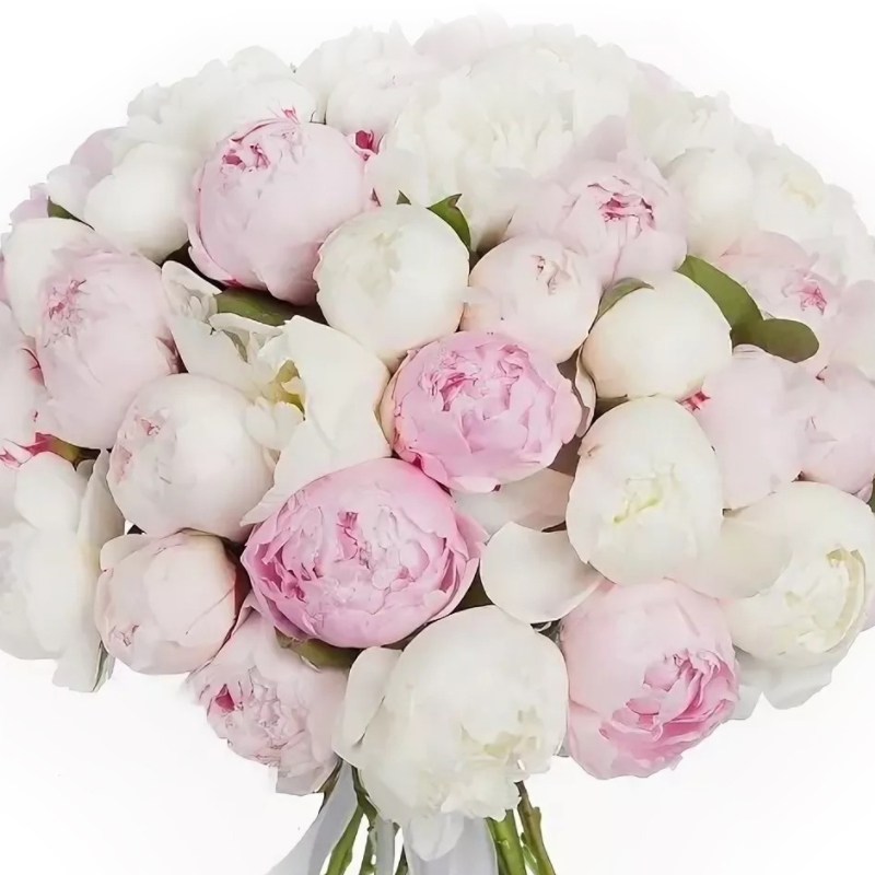 Букет состоит из MIX из 51 белого и розового пиона, прозрачная упаковка, атласная лента.