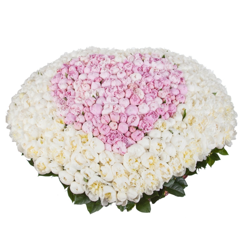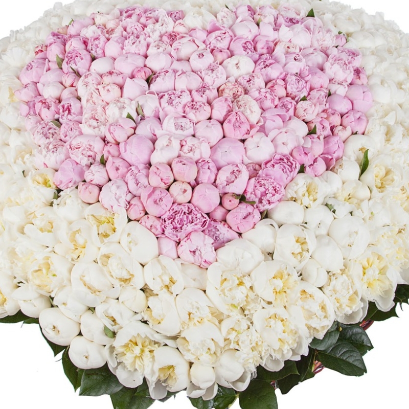 Сердце из белых и розовых пионов в корзине
