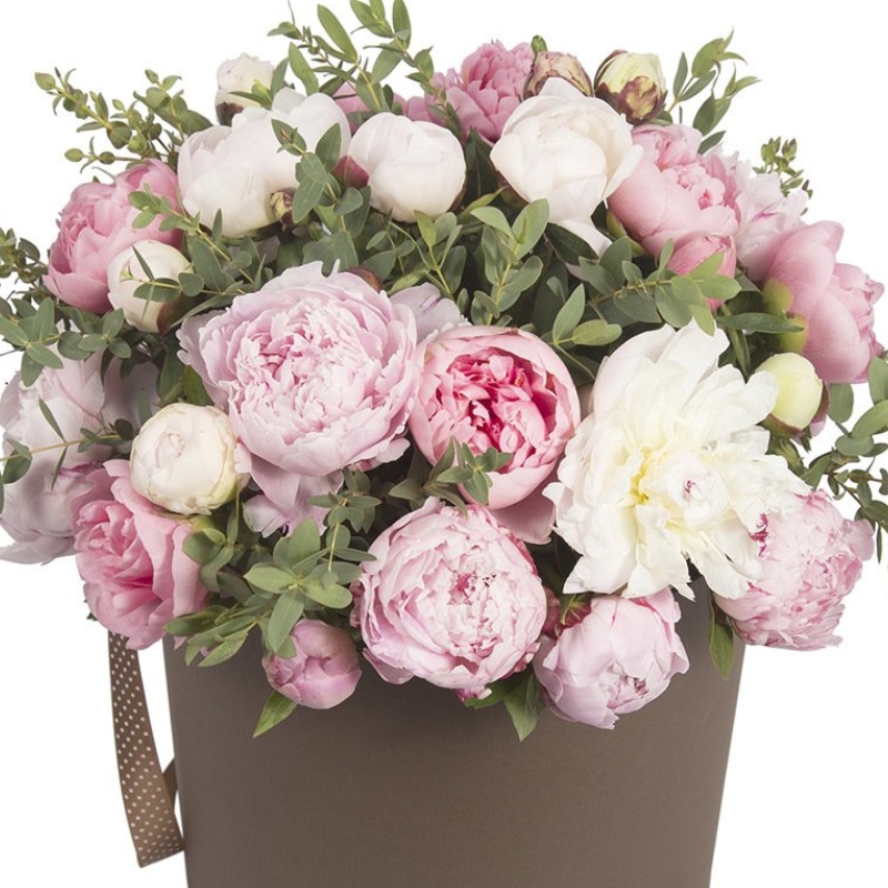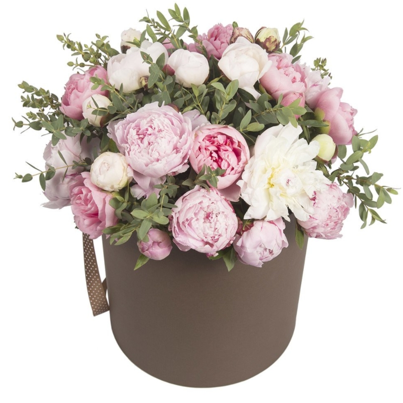 13 розовых пионов, 12 белых пионов, зелень, коробка, оазис.