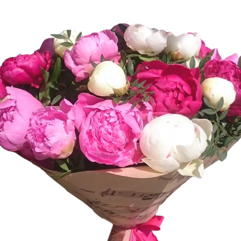 Букет состоит из MIX из 17 пионов, зелень, крафт, атласная лента.