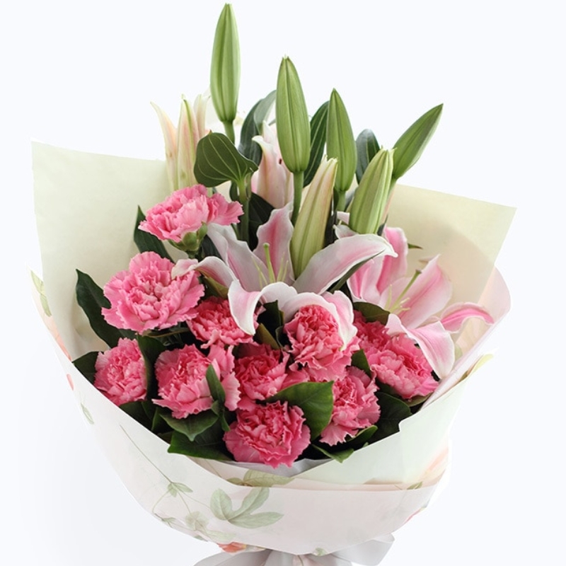 Букет состоит из 11 розовых гвоздик, 3 лилии, зелень, красивая упаковка, атласная лента.