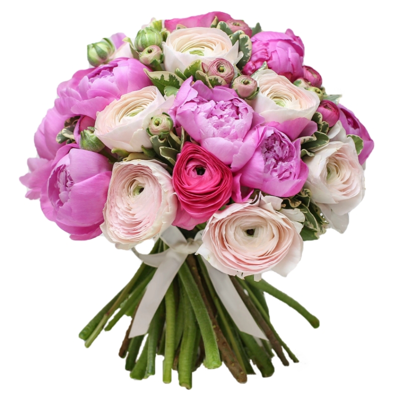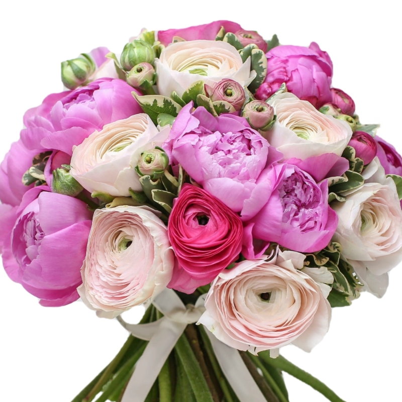 Букет состоит из 10 ранункулюсов, 9 пионов, зелень, прозрачная упаковка, атласная лента.