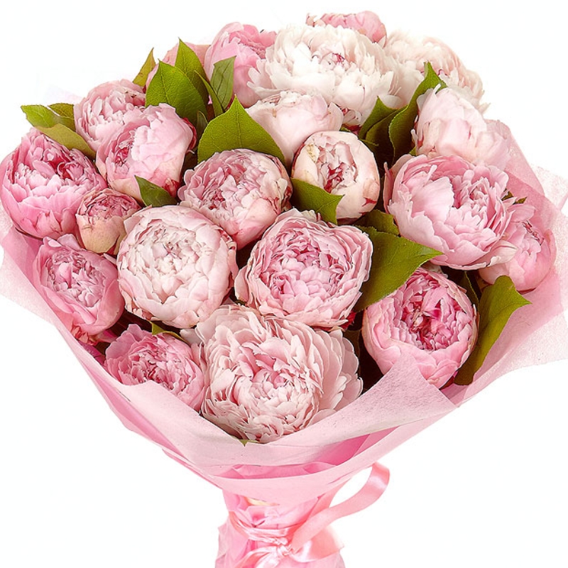 Букет состоит из 21 розовый пион, зелень, красивая упаковка, атласная лента.