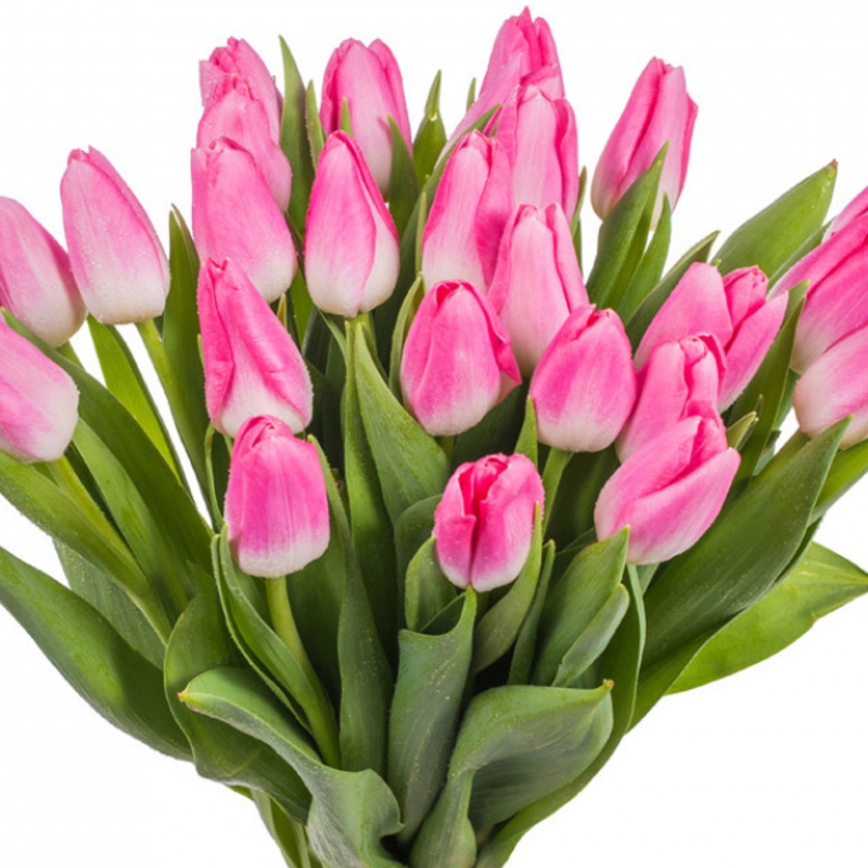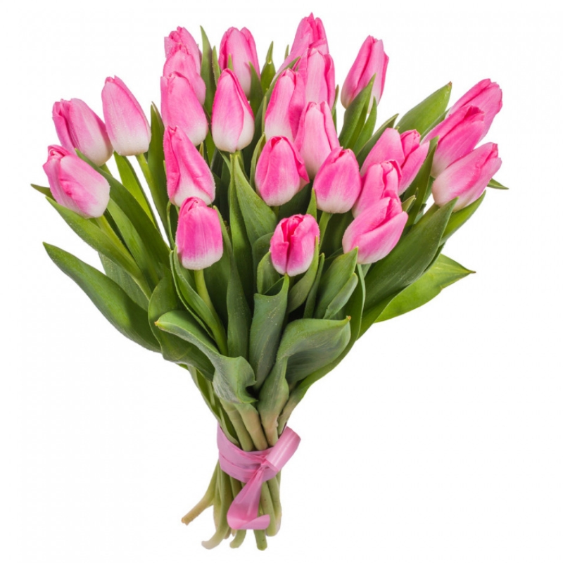 Букет состоит из 23 розовых тюльпана, прозрачная упаковка, атласная лента.