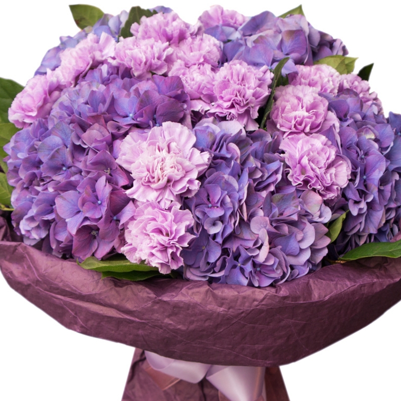 Букет состоит из 5 сиреневых гортензий, 14 гвоздик, зелень, красивая упаковка, атласная лента.