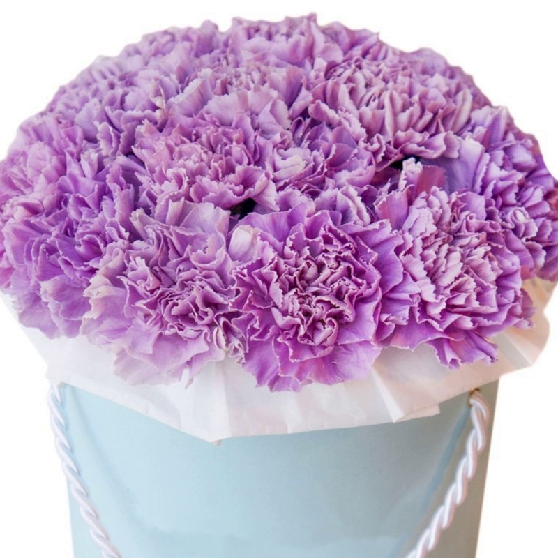 Букет состоит из 25 сиреневых гвоздик, коробка, оазис.