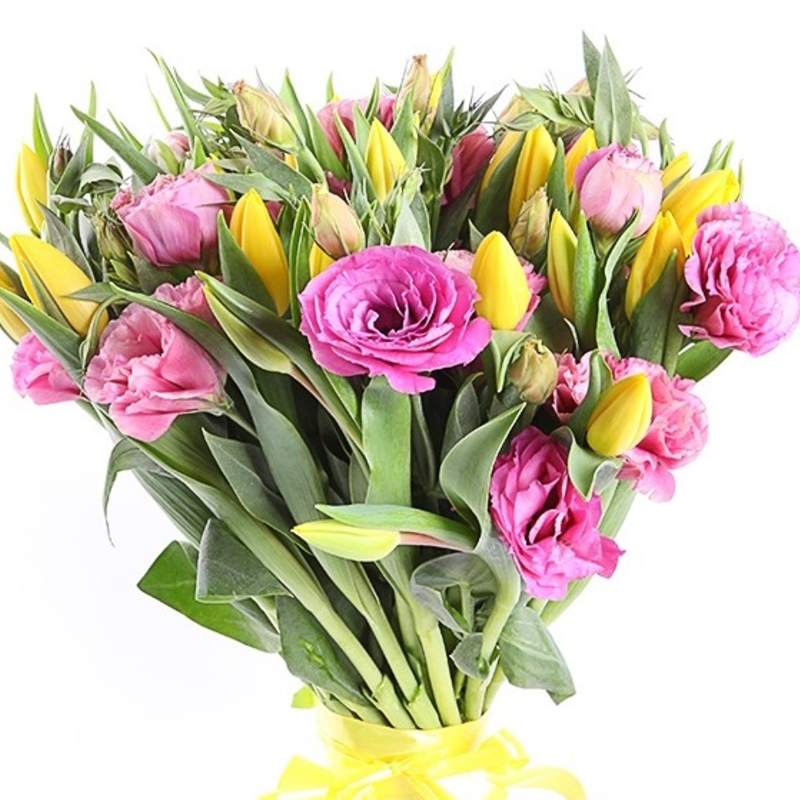 Букет состоит из 19 желтых тюльпанов, 8 веток эустомы, зелень, прозрачная упаковка, атласная лента.